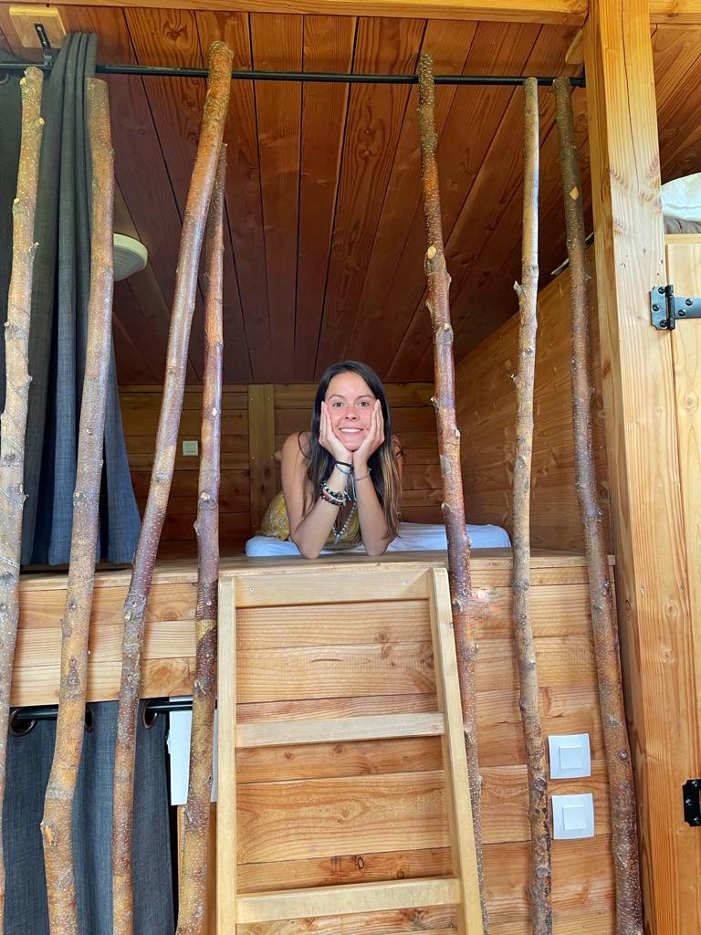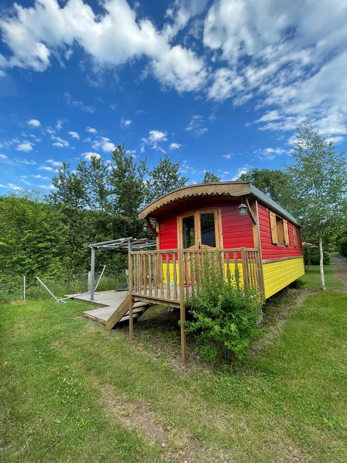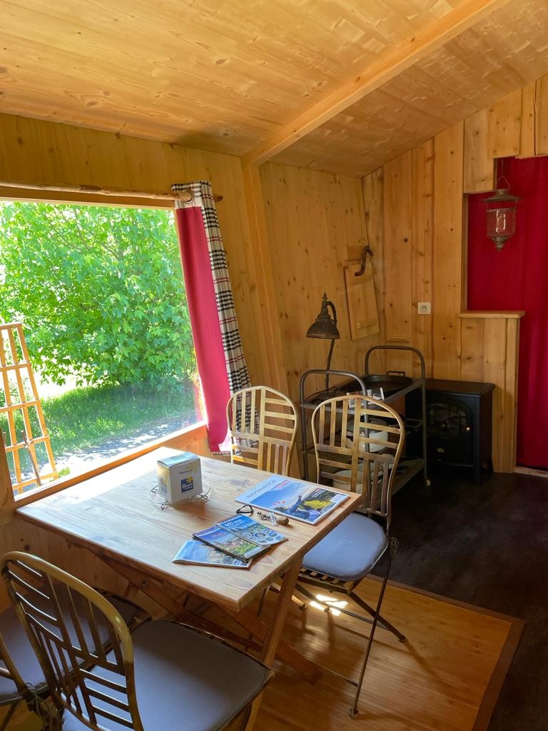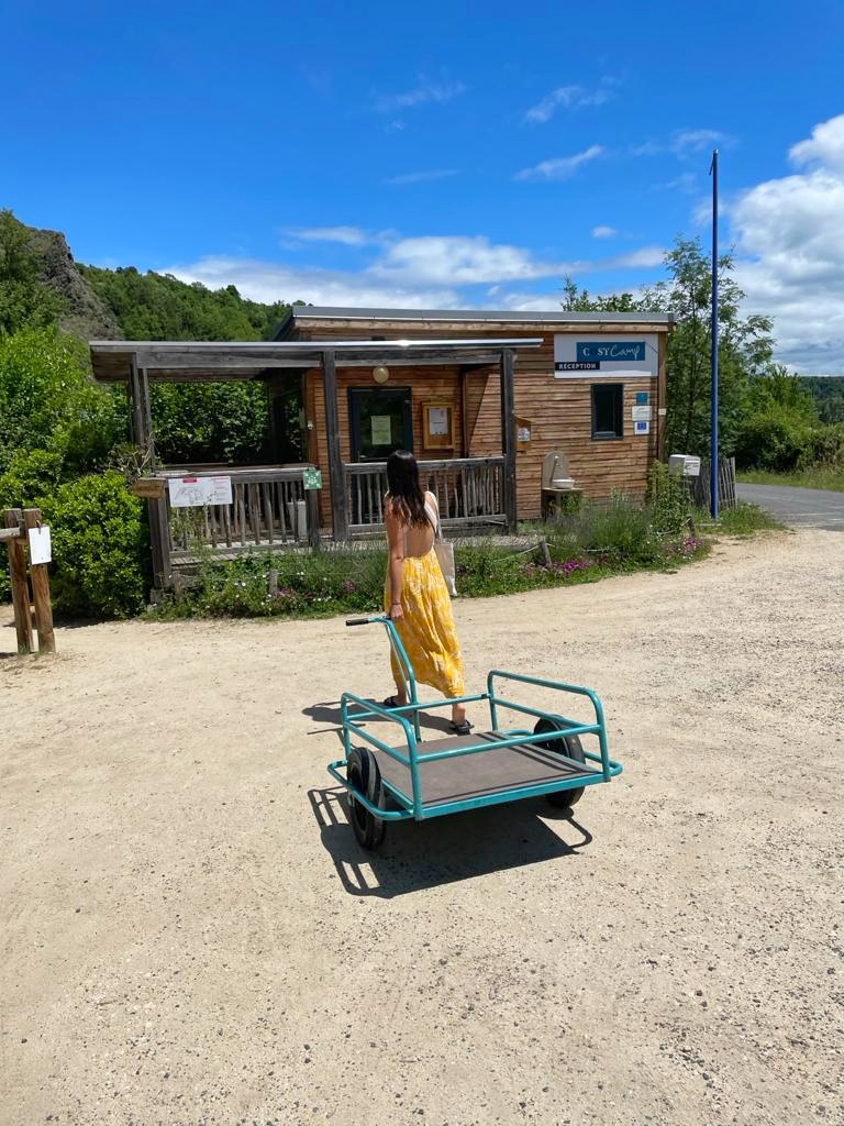 Nous sommes arrivées au camping dans un cadre naturellement magnifique. Les lieux sont arborés, d’un calme absolu et la rivière offre une atmosphère idyllique. Nous sommes accueillies chaleureusement par Michel et Magali, les propriétaires des lieux. Ils nous mènent à notre logement insolite mais heureusement pour nous, tout équipé !