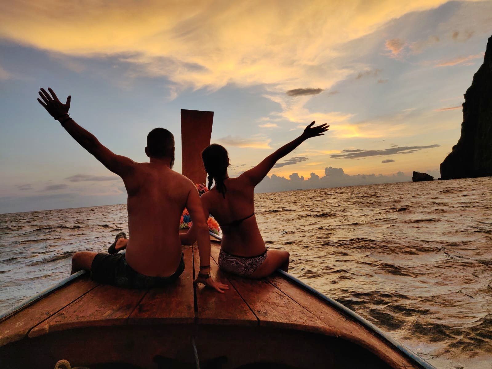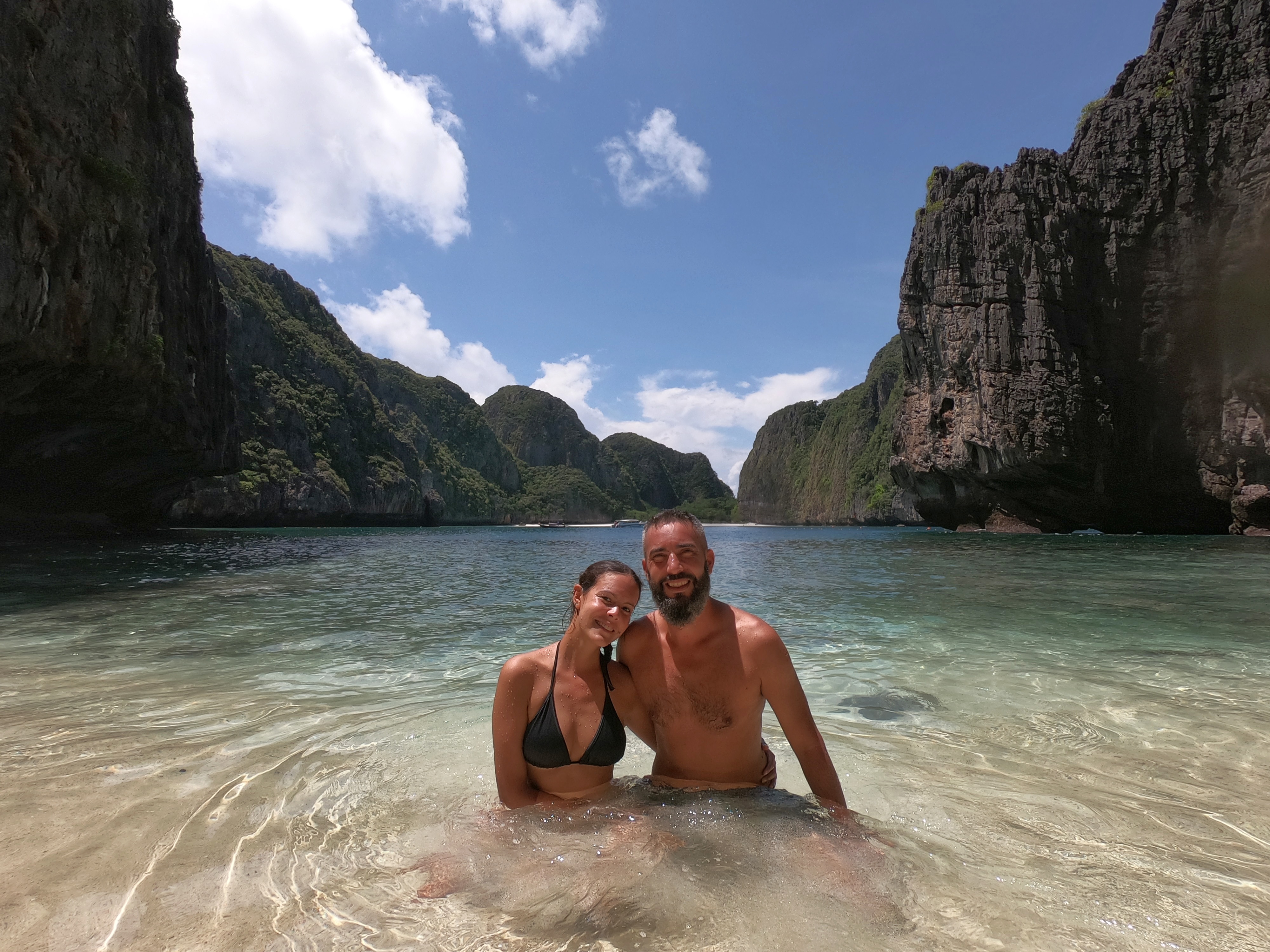 Nous avons vu la fameuse plage Maya Bay du film « La plage », interdite au public afin de permettre à la nature de se renouveler. Notre capitaine nous laisse nous baigner autant de temps que nous le désirons et sa gentillesse ne s’arrête pas là. En effet, à 14h, quand l’excursion touche normalement à sa fin, il accepte de nous garder avec lui jusqu’au couché du soleil. Juste avant que la nuit ne tombe, il s’arrête en pleine mer pour nous laisser nager avec les requins à pointe noire 🙂