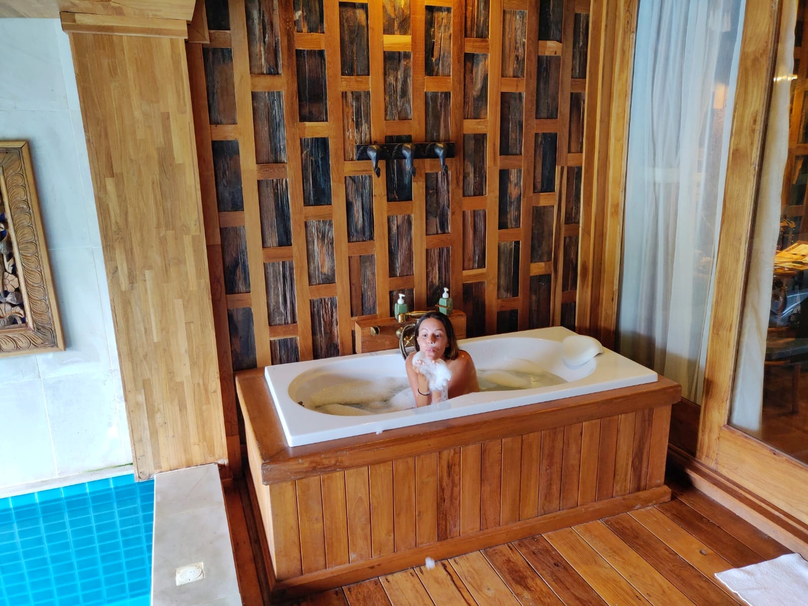 Prendre le temps et se faire plaisir fait aussi parti du voyage. C’est dans cette optique de plaisir et pour fêter mon anniversaire, que nous passons trois nuits au Santhiya tree. Je n’ai rien à redire, c’est une merveilleuse découverte. Tout est parfait, de la décoration au personnel, en passant par le petit déjeuner. Nous avons une chambre avec piscine et baignoire privée, et même une vue sur la montagne. Que rêver de mieux ?