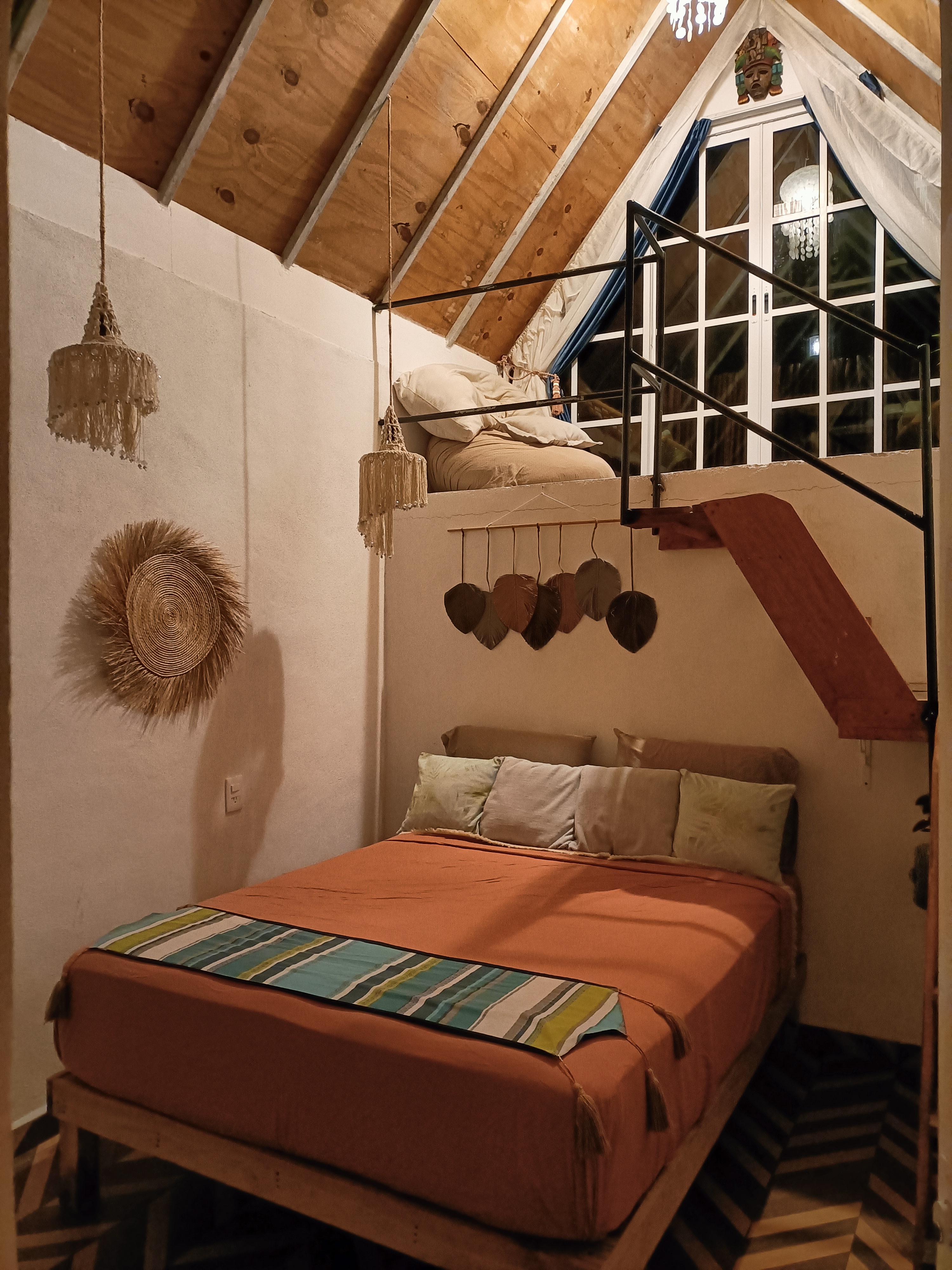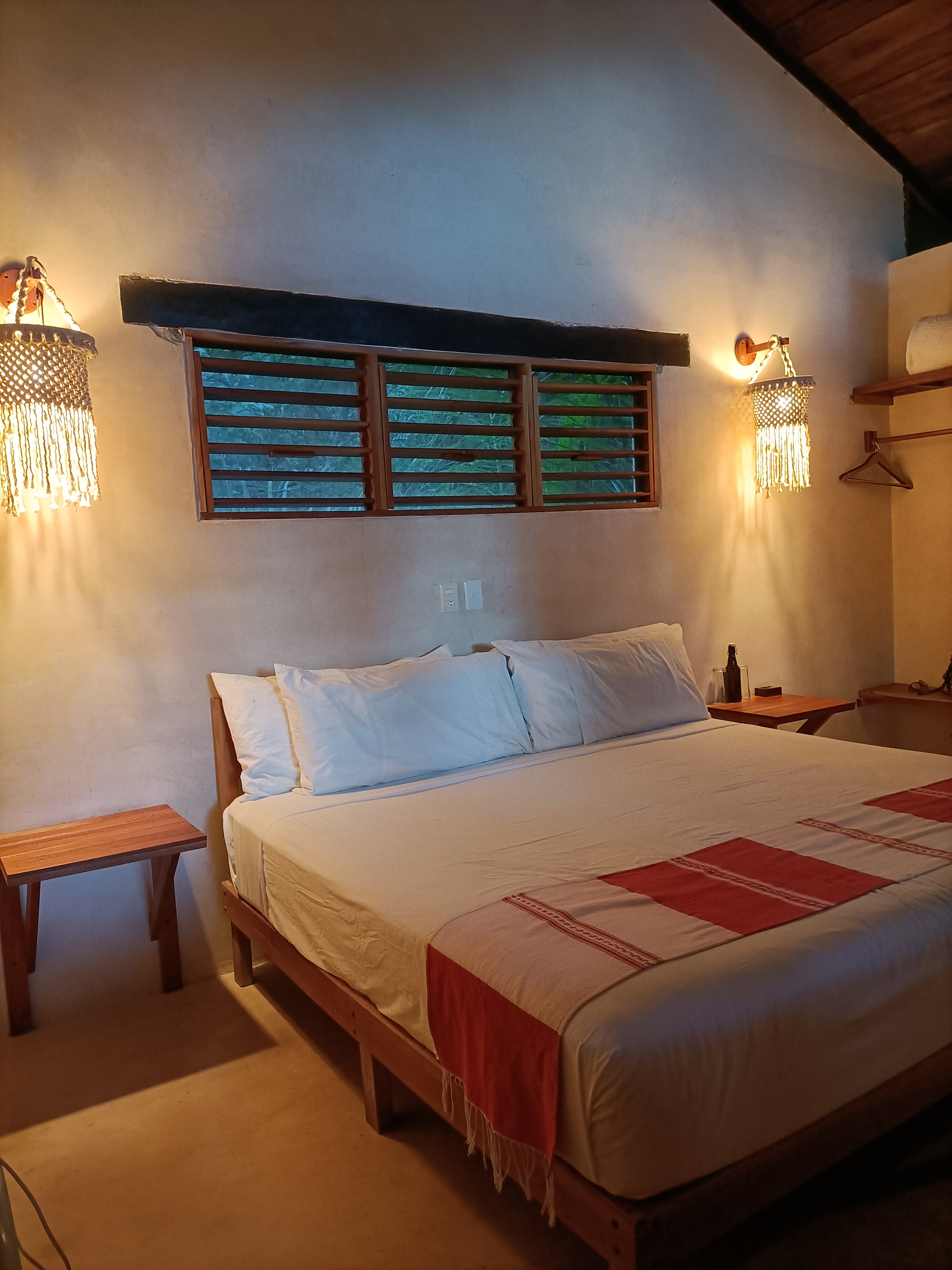 Nous choisissons un hébergement avec les amis que nous nous sommes fait la veille, autour d’une bière (bon ok pas qu’une). L’Hotel Buenavista Bacalar – Yoga & Meditation Included situé à 30km de Bacalar et donc 50km de Los rapidos (que nous n’avons pas pu faire), est un endroit canon. L’hôtel met à disposition des canoës, des cours de yoga inclus, un petit-déjeuner inclus, les logements sont des cabanes spacieuses en pleine forêt. Je n’ai rien à redire, c’est vraiment top, mise à part les moustiques et le prix. Mais c’est le coût du calme et de la paix en pleine nature.