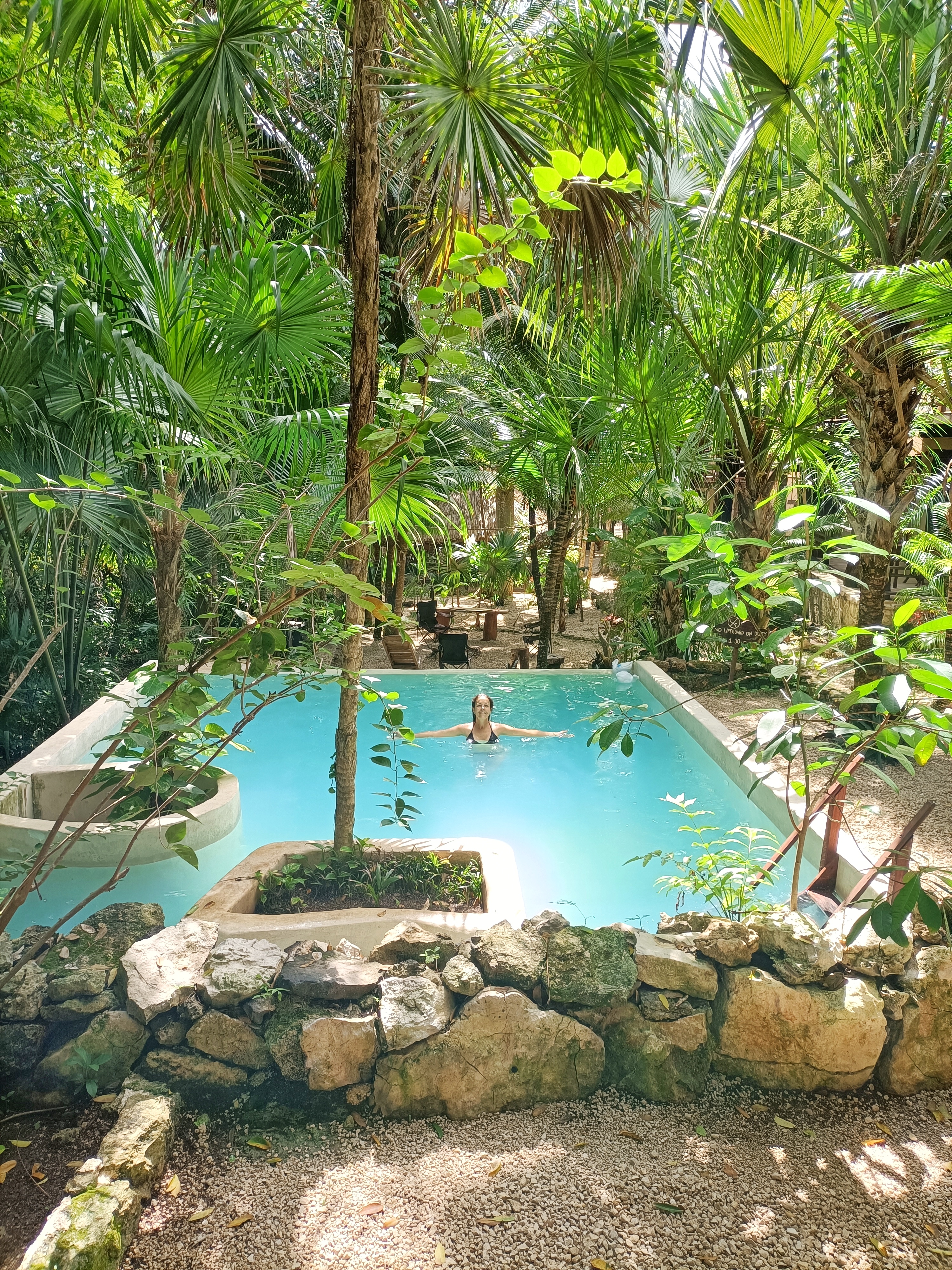 Pour visiter Tulum, nous réservons à The reserve. Il s’agit de charmantes petites maisons très bien aménagées, avec une belle piscine et des transats au calme.