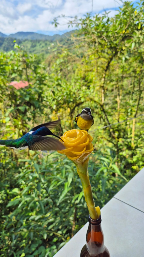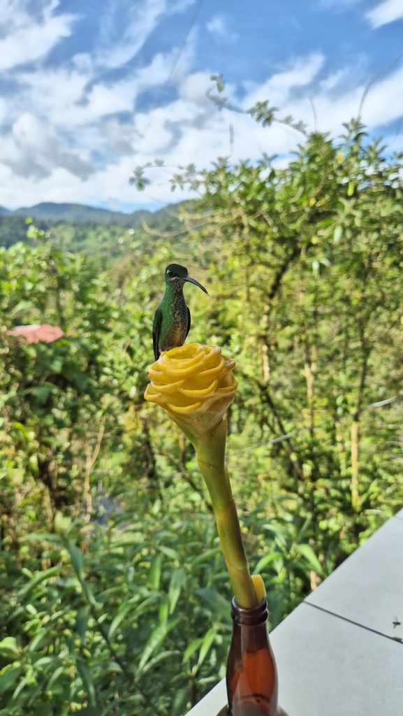 Avant de partir nous avons fait une activité pour observer les colibris sauf que je ne vous le recommande pas forcément car ils sont nourris à base d’eau sucré ce qui les fait venir quasiment dans votre main. On pensait à quelque chose d’étique, les voir chez quelqu’un dans leur environnement sauf que ce quelqu’un pose des mangeoires partout dans son immense jardin. Punto Ornitologico Mindo est l’endroit que nous avons contacté alors oui les colibris sont magnifiques et les observer de si près était incroyables mais je suis partie avec un goût amer de l’expérience